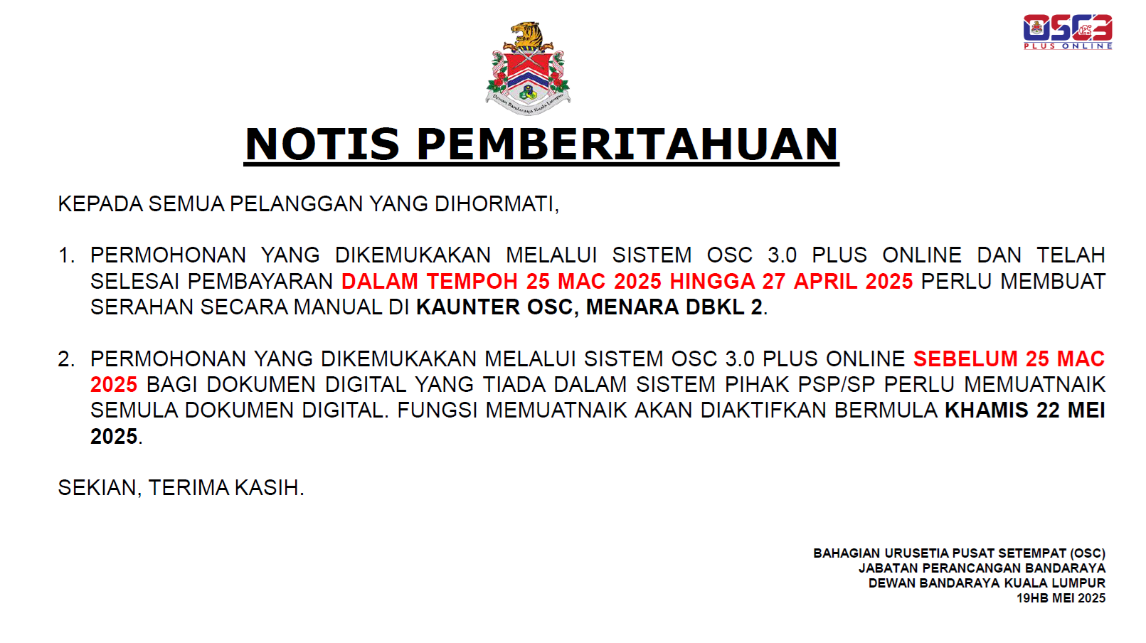 - PERMOHONAN YANG DIKEMUKAKAN MELALUI SISTEM OSC 3.0 PLUS ONLINE SEBELUM 25 MAC 2025 BAGI DOKUMEN DIGITAL YANG TIADA DALAM SISTEM PIHAK PSP/SP PERLU MEMUATNAIK SEMULA DOKUMEN DIGITAL. FUNGSI MEMUATNAIK AKAN DIAKTIFKAN BERMULA KHAMIS 22 MEI 2025.